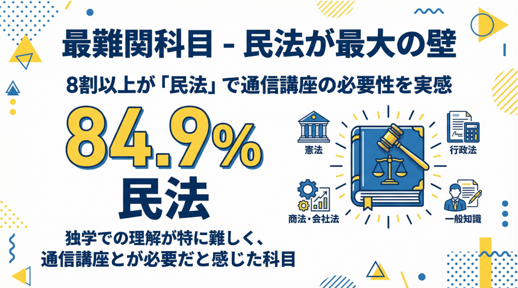 民法は、行政書士試験の根幹をなす科目でありながら、その複雑さや膨大な判例の存在から、多くの受験者が独学での完全な理解に困難を感じていることがわかります。
