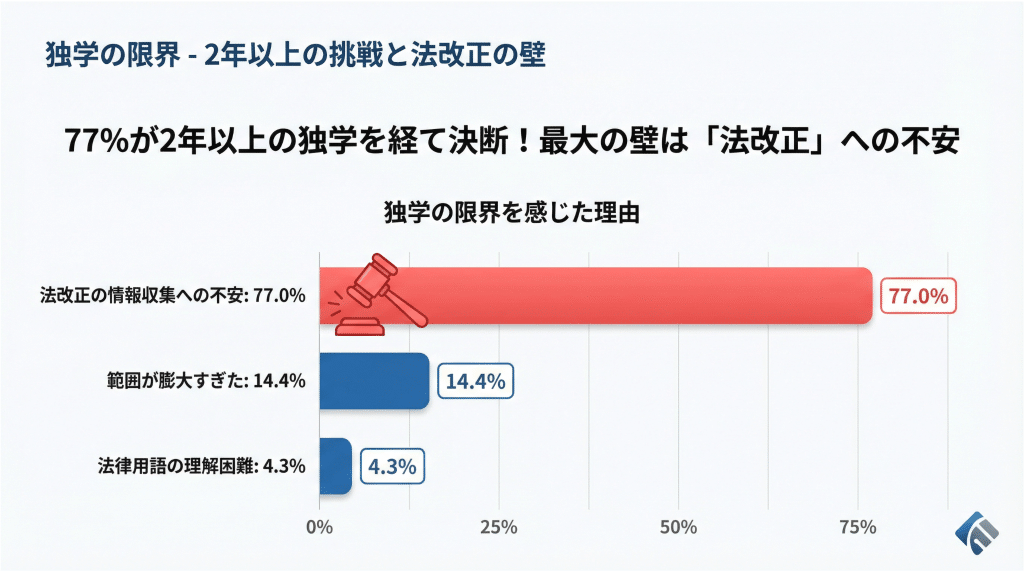 【独学の限界】77%が2年以上の独学を経て決断!最大の壁は「法改正」への不安