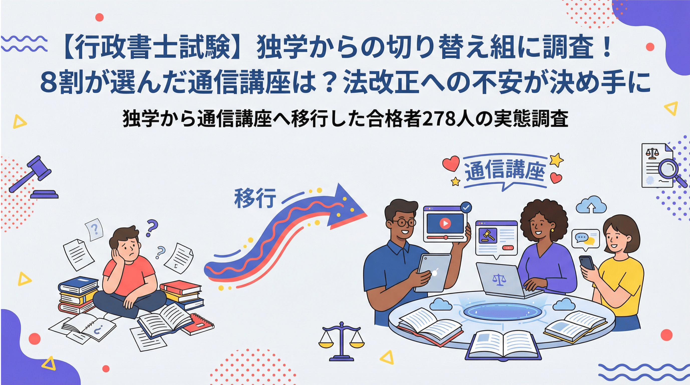 今回の調査から、行政書士試験の合格を目指す多くの受験者が、2年以上の独学期間を経て、「法改正への対応」という壁に直面し、通信講座へと移行している実態が明らかになりました。