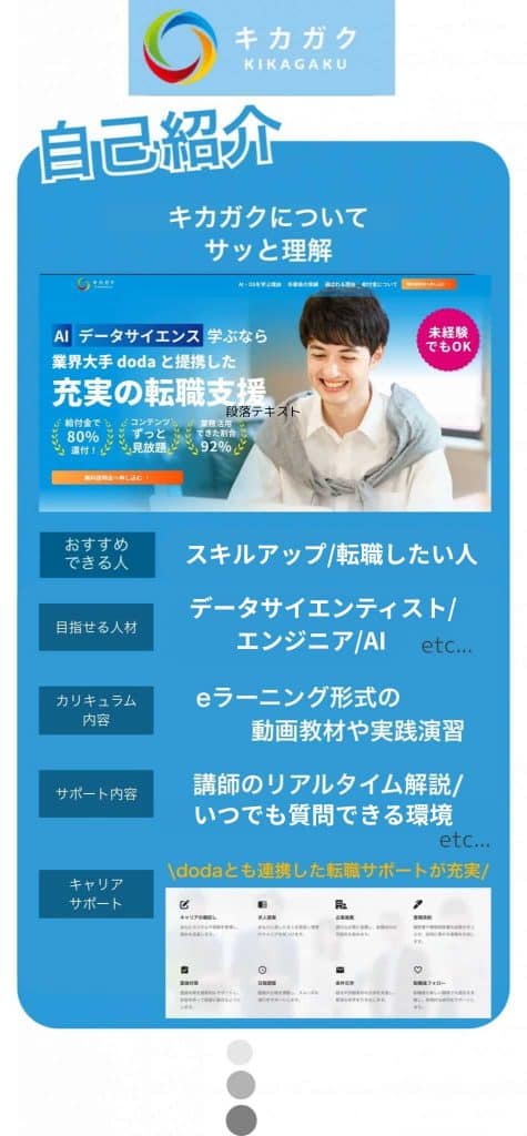 また、キカガク独自のキャリア支援サービスである「キカガクキャリア」も提供しており、キャリアについての相談や企業選びのアドバイスなど、長期的な視点でのサポートも行っています。