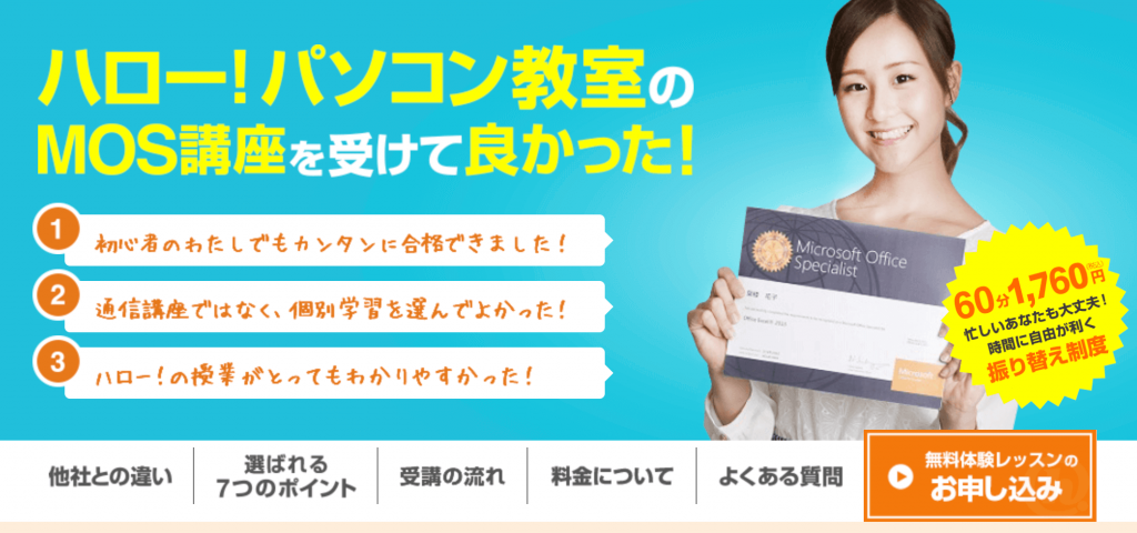 | 6位 ハロー! | 10,780円 | MOSに関して分からない所はすぐに質問可能! | 個人の都合に合わせられるため、個人差あり。 |