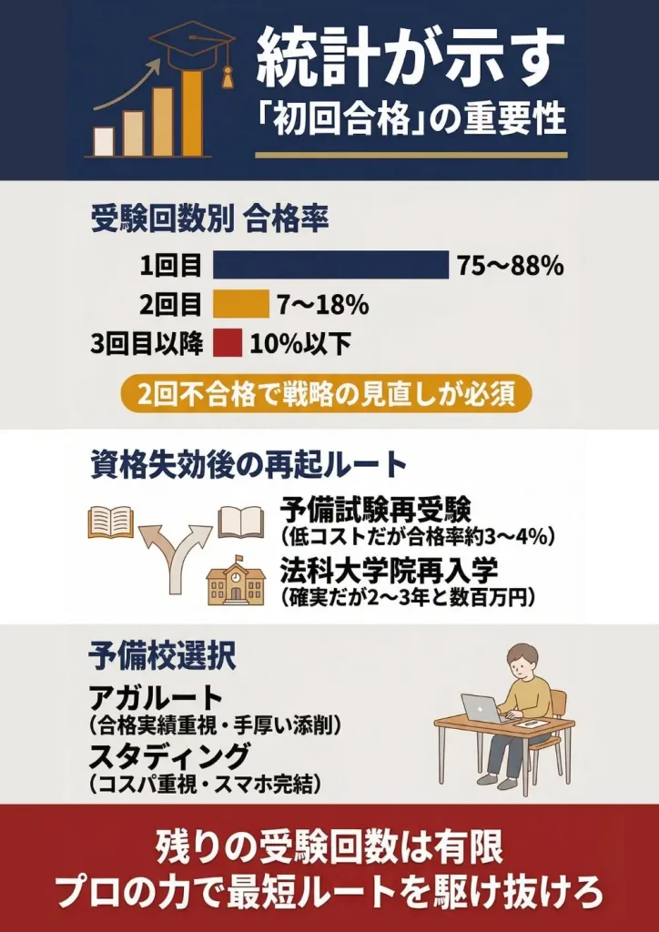 ここまで、司法試験の回数制限に関するルールや統計的な現実を見てきました。