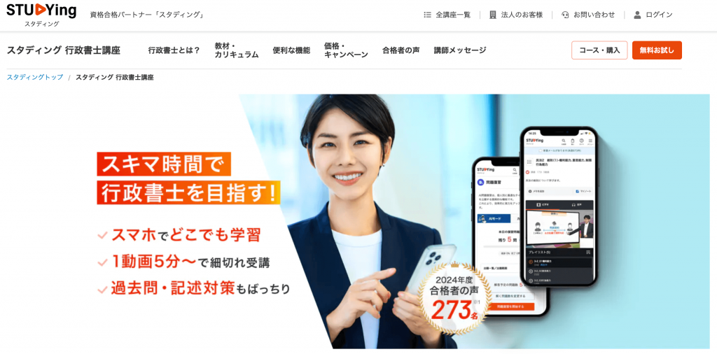 資格取得をサポートする通信講座のスタディングでは、「行政書士」の国家資格試験に向けた対策講座を展開しています。