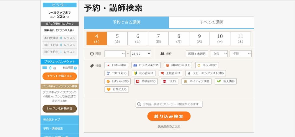 講師の検索画面にて、ネイティブなどのチェックを外し、国籍を「フィリピン」に設定して検索してみてください。すると、フィリピン国籍の講師のみが表示されます。