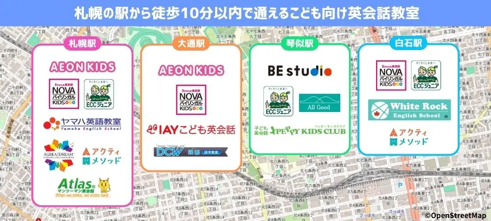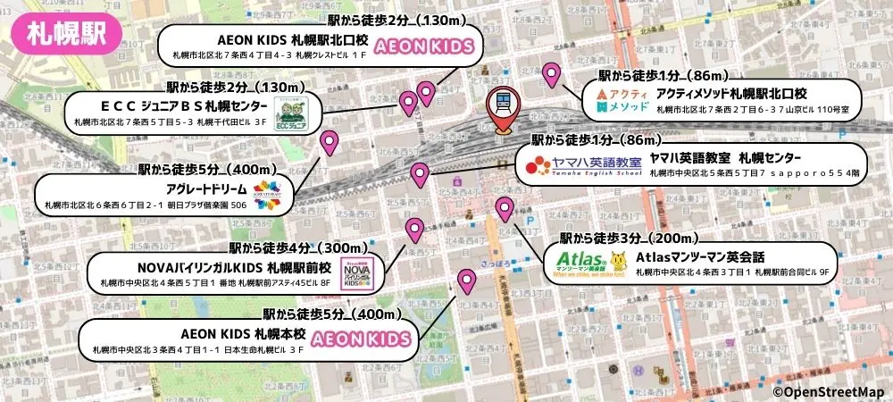 - 札幌駅:AEON KIDS、ECC ジュニア、アグレートドリーム、NOVAバイリンガルKIDS、AEON KIDS、アクティメソッド、ヤマハ英語教室、Atlasマンツーマン英会話