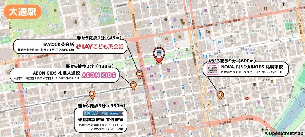 - 大通駅:IAYこども英会話、AEON KIDS、NOVAバイリンガルKIDS、来都語学教室