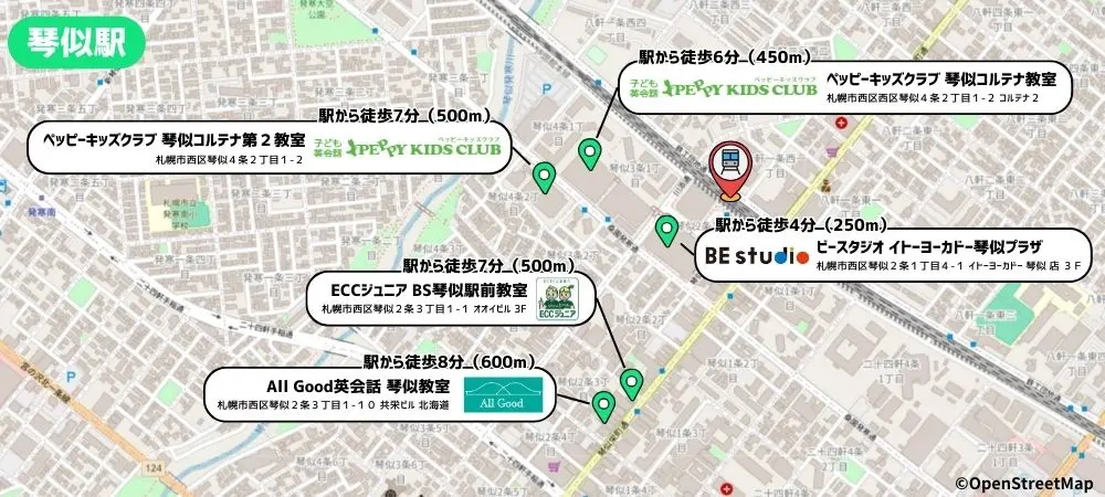 - 琴似駅:ペッピーキッズクラブ、ビースタジオ、ECCジュニア、All Good英会話