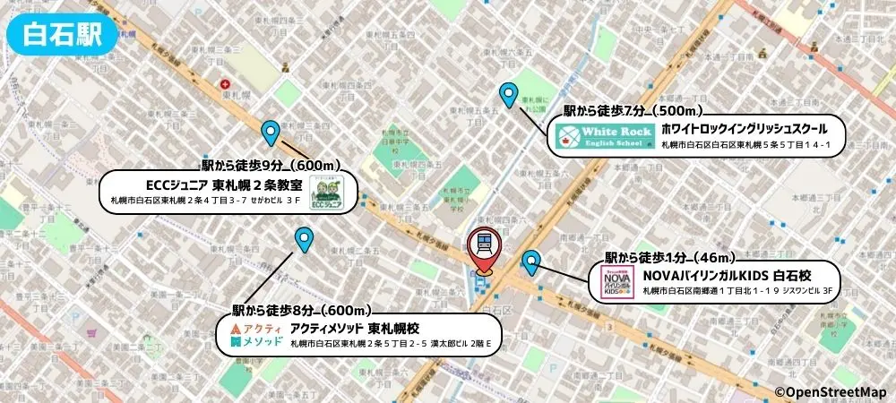 - 白石駅:ホワイトロックイングリッシュスクール、NOVAバイリンガルKIDS 、アクティメソッド、ECCジュニア
