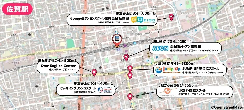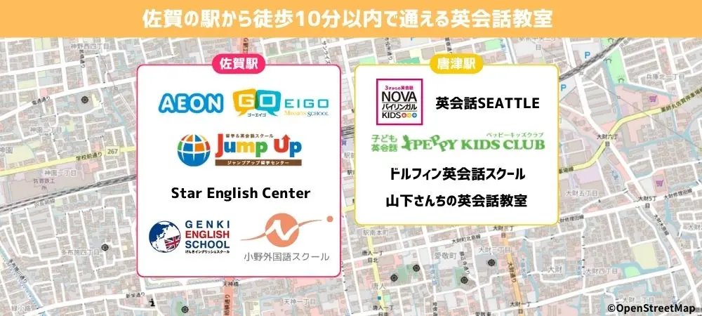 - 佐賀駅:英会話イーオン、JUMP-UP英会話スクール、小野外国語スクール、げんきイングリッシュスクール、Star English Center、Goeigoミッションスクール