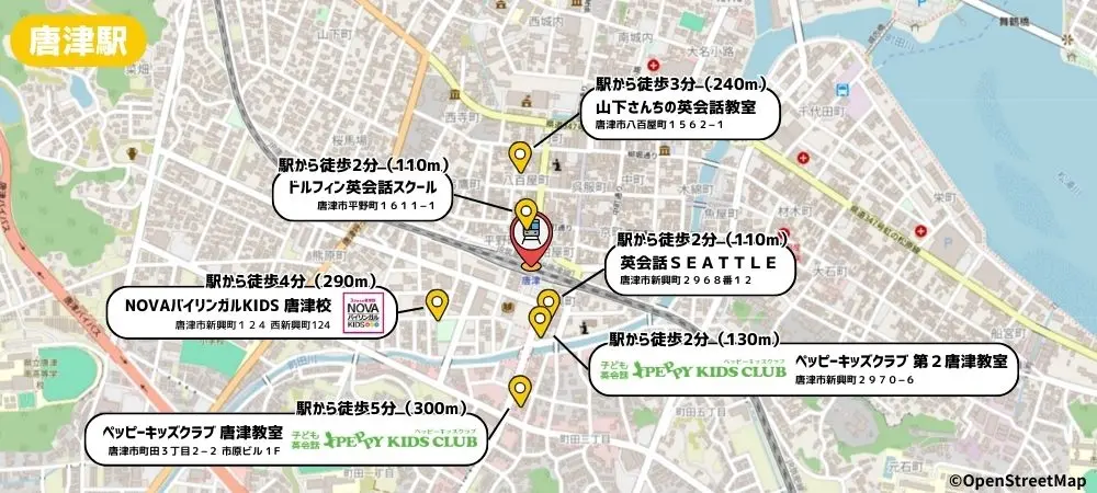 - 唐津駅:NOVAバイリンガルKIDS、ペッピーキッズクラブ、英会話SEATTLE、山下さんちの英会話教室、ドルフィン英会話スクール