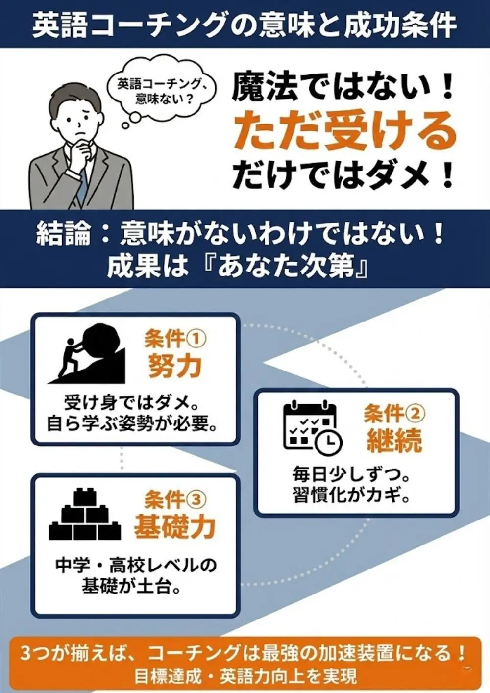英語コーチングで成果が出にくい人は、努力が足りないからではなく、学習効果を最大化するための前提条件が整っていない傾向にあります。