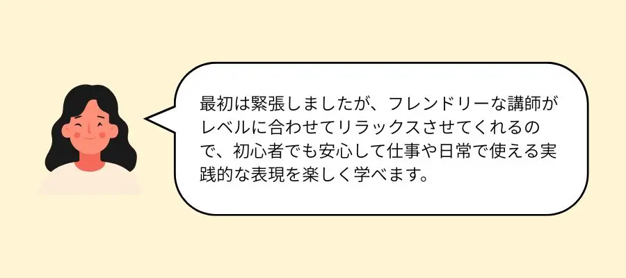 実際の口コミでも、「講師の雰囲気が良く安心して話せた」という声がありました。