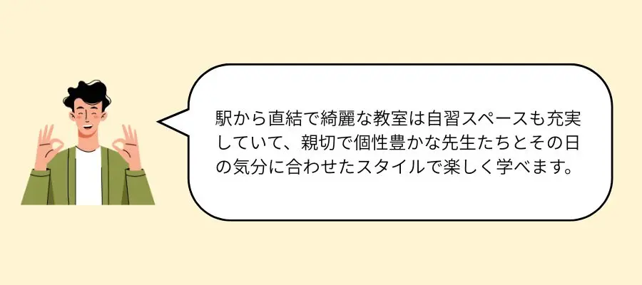 ただし料金は少し高めなので、無料体験レッスンの際に、入会金やテキスト代も含めた合計金額を事前に確認してください。