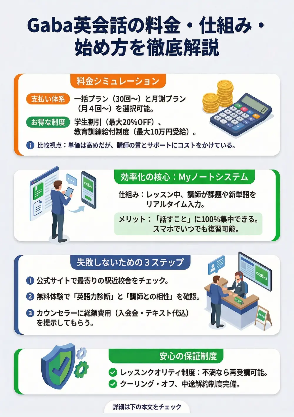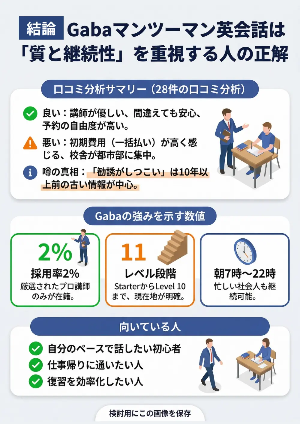 Gabaマンツーマン英会話は「講師が優しい」「間違えても急かされない」と評価される一方、「料金が高い」「勧誘がしつこい」と不安になる声も見かけます。