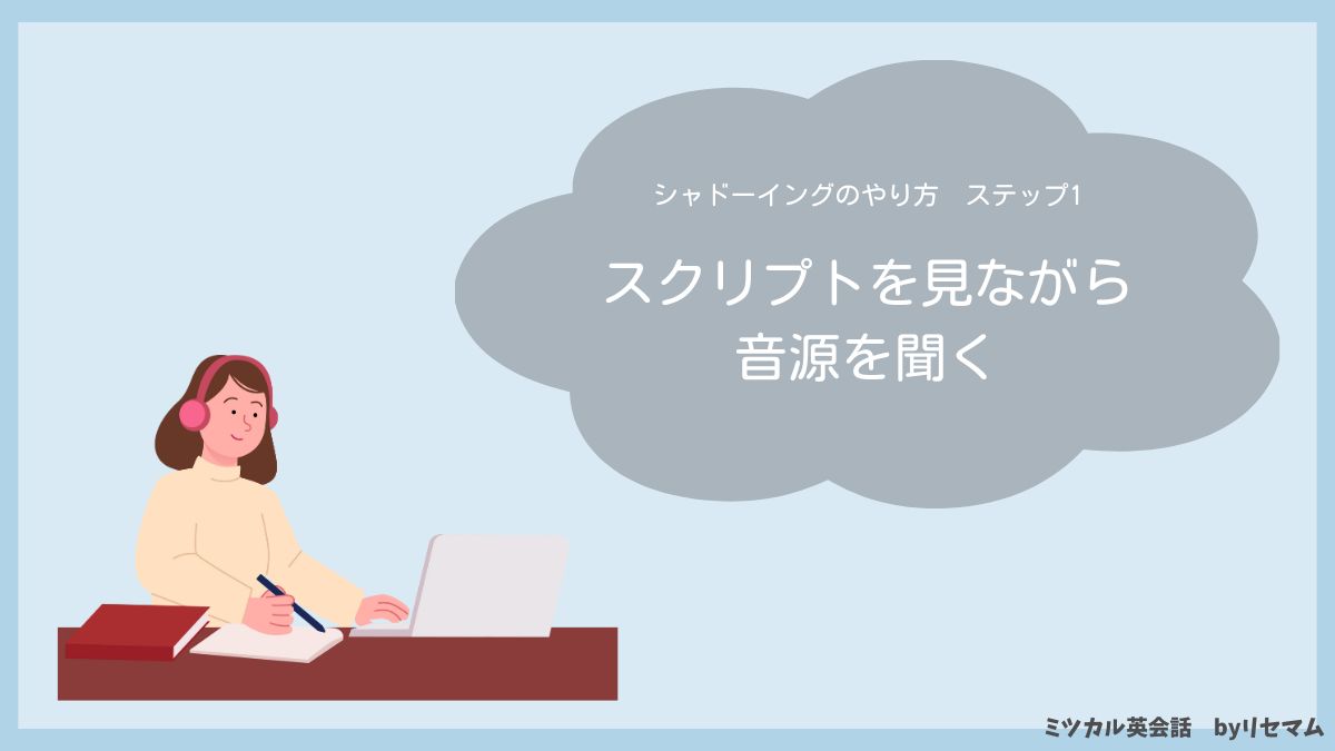 また、基本的には音源のスクリプトは見ずに聞いたままを追いかけて行くのですが、スクリプトを見て行う場合も「シャドーイング」となります。