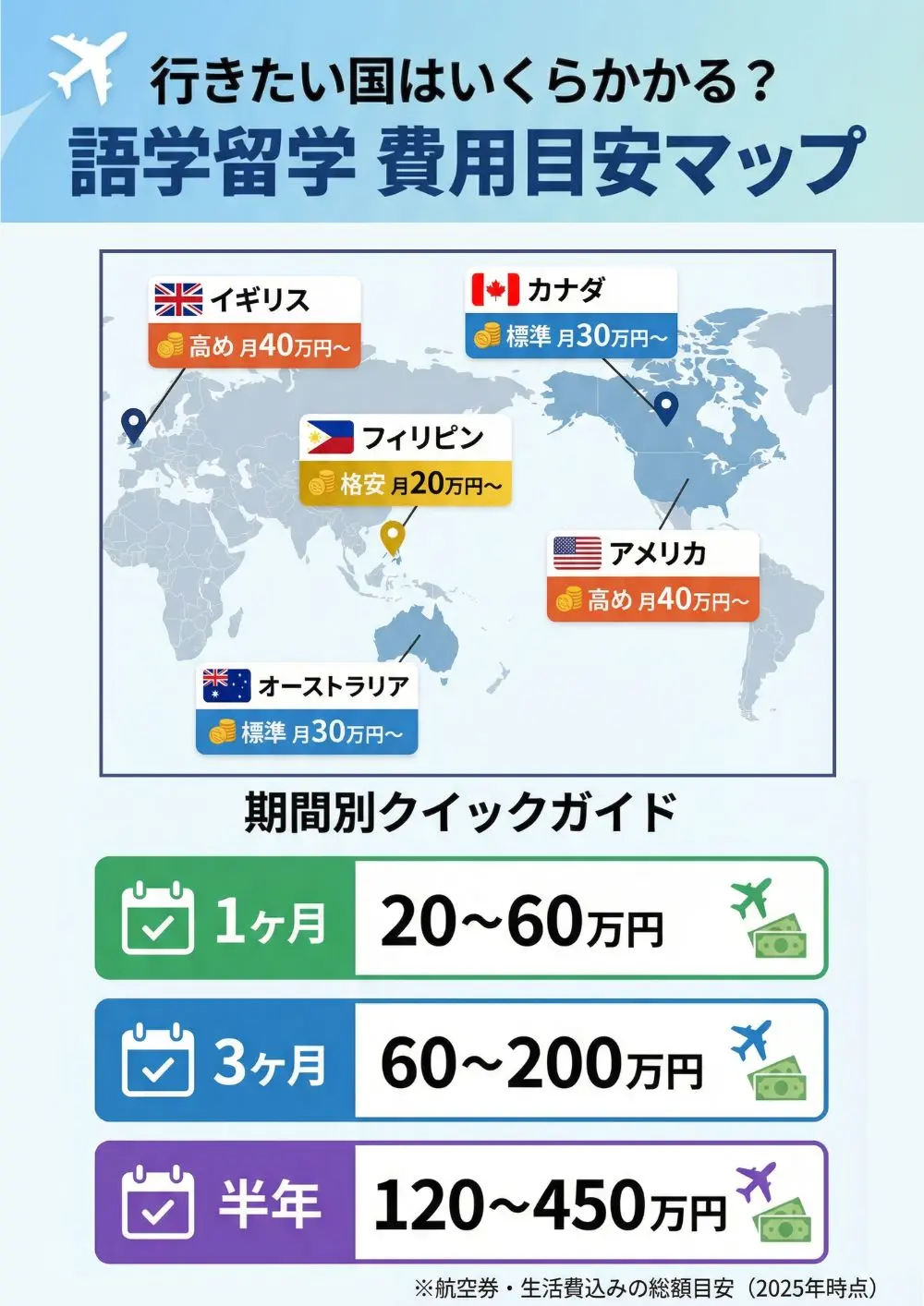 ひと目でわかる!主要国・期間別の費用相場表