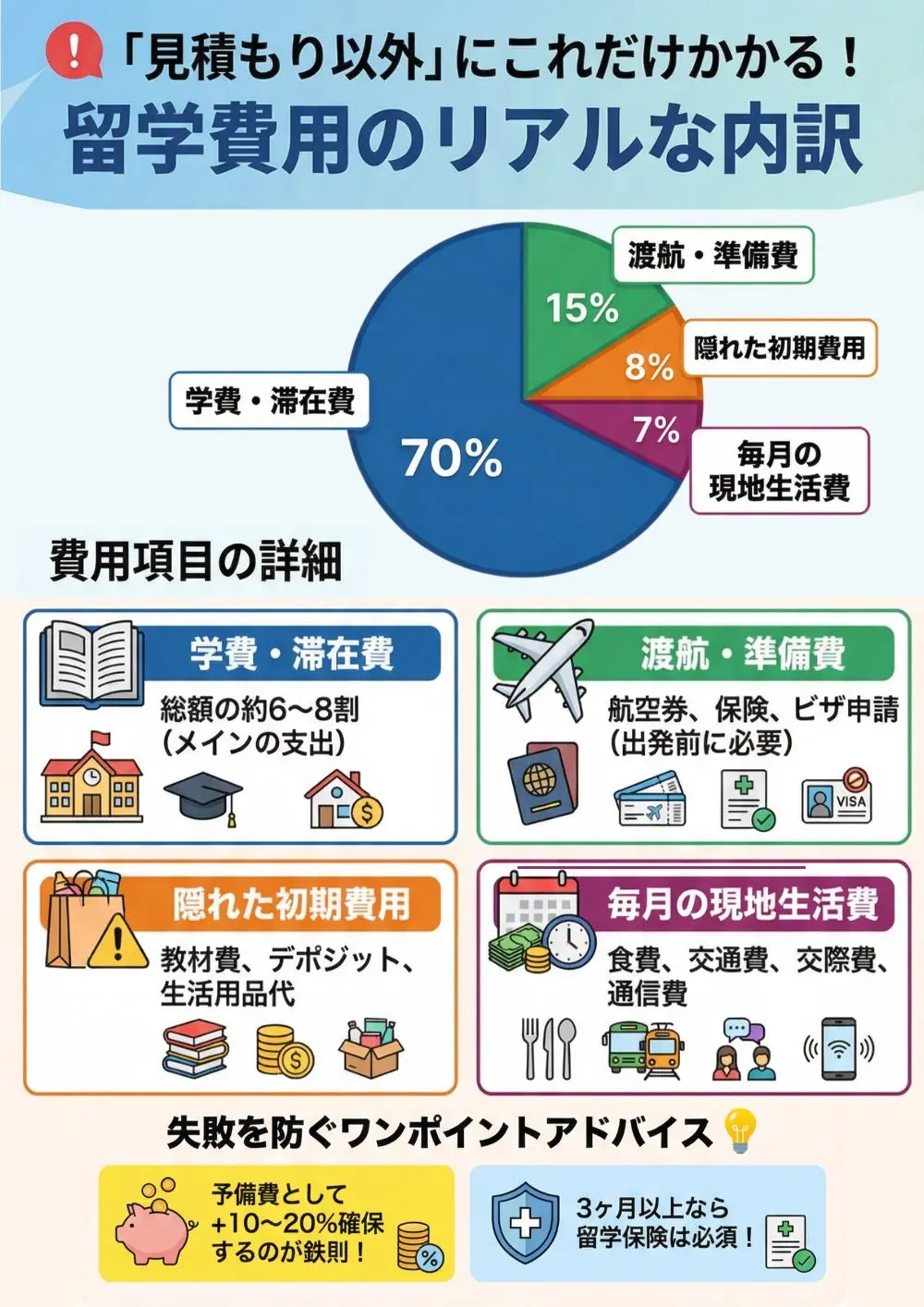 授業料や航空券だけでなく、現地の物価上昇や為替変動、住まいのトラブル、体調不良による通院などで、予定より大きく出費が膨らむケースが少なくありません。