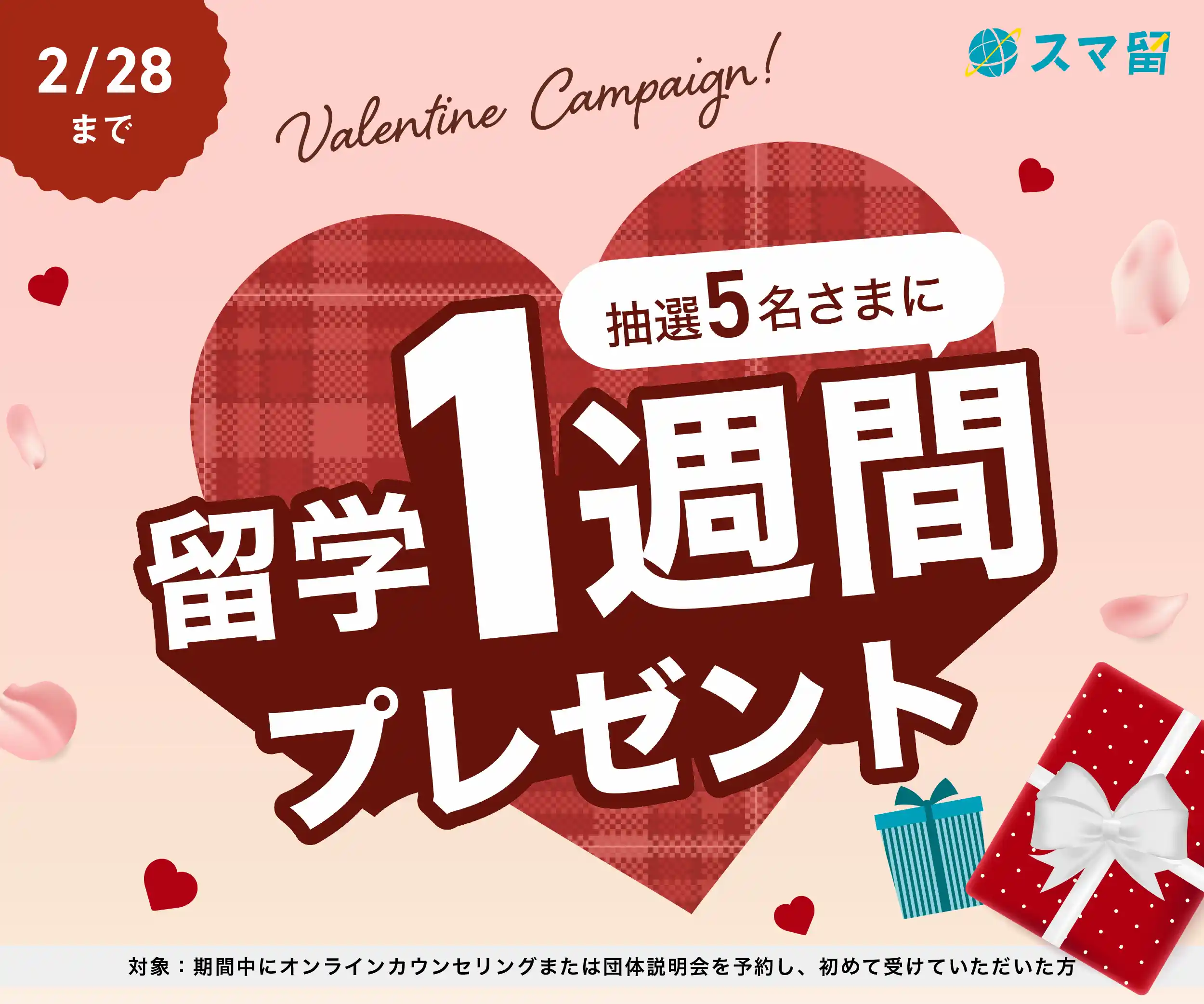 | キャンペーン情報 | 【2026年2月28日まで】「留学1週間」が当たる!スマ留Valentine Campaign |