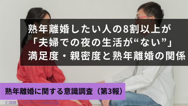 既婚者マッチングサイト「Healmate(ヒールメイト)」を運営するレゾンデートル株式会社(東京都渋谷区 https://raisondetre-inc.co.jp)は、2026年2月にインターネット上で一般の40代~50代既婚者男女2,000人を対象に「熟年離婚」に関する意識調査を行いました。今回はその第3報を紹介します!
