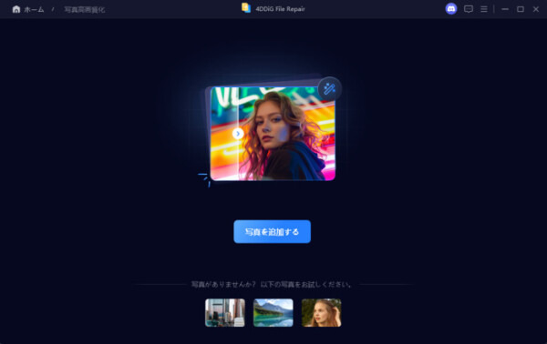 画像を元のサイズよりも大きくした場合の問題点は、画質の低下でしょう。そこで、サイズ変更後の高画質化方法には4DDiG File Repairがおすすめです。このツールは、ぼやけた写真や低画質な写真をAIにより高画質化できます。手順は以下のとおりです。