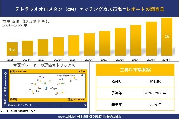 テトラフルオロメタン(CF4)エッチングガス市場に関する当社の調査レポートによると、テトラフルオロメタン(CF4)エッチングガス市場規模は 2035 年に約 16億米ドルに達すると予想されています。さらに、2025 年の テトラフルオロメタン(CF4)エッチングガス市場規模は約 8.5億米ドルとなっています。テトラフルオロメタン(CF4)エッチングガスに関する市場調査レポートでは、市場は 2026-2035 年の予測期間中に約 6.5% の CAGR で成長するとも述べられています。