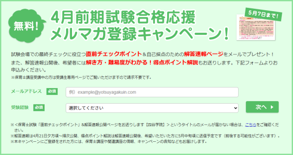 過去に四谷学院のスタッフが試験当日に一部の会場前で配布した際は、「直前チェックポイントで出た問題が的中した!」とご好評をいただいていました。会場配布は取りやめさせていただくことになりましたが、保育士試験受験生の合格の一助になればと、メールにて配信することにいたしました。