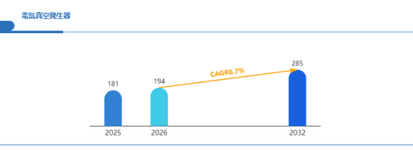 Global Reports調査チームの最新レポート「グローバル電気真空発生器市場規模、主要企業シェア、ランキング分析レポート【2026年版】」によると、2026年の194百万米ドルから2032年には285百万米ドルに成長し、2026年から2032年の間にCAGRは6.7%になると予測されています。