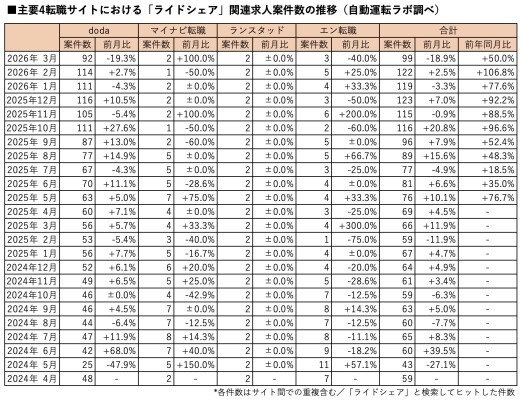 主要転職4サイトにおけるライドシェアの関連求人案件数(※「ライドシェア」と検索してヒットした求人)は前月比18.9%減、前年同月比50.0%増の99件となりました。