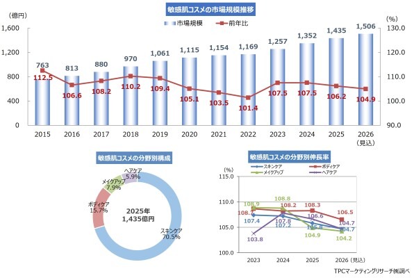 ◆2026年については、2025年比4.9%増の1,506億円で推移する見込み。引き続き高機能アイテムが売上を伸ばすなか、高機能クリームや美容液などスペシャルケアアイテムが牽引すると考えられる。また、科学的根拠に基づいたダーマコスメの存在感が一層高まるとみられるほか、生活全体に広がるトータルケア志向の高まりで複数の肌悩みに対応する高付加価値商品の展開が進むことで、同市場はさらなる成長フェーズへ移行していくとみられる。