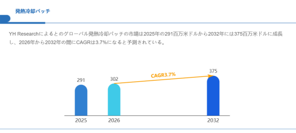 グローバル発熱冷却パッチ市場は、2032年には約375百万米ドルに達すると予測されています。2026年から2032年にかけての年平均成長率(CAGR)は3.7%と見込まれており、2026年の市場規模は約302百万米ドルと推計されています。この成長は、技術革新、需要の増加、規制や産業構造の変化などの要因に支えられています。