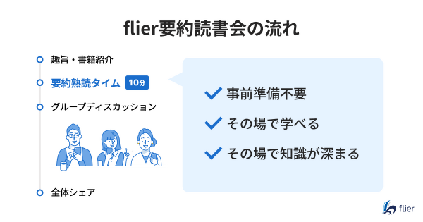 ただ、「事前に本を読んでおく必要がある」となると、少しハードルが高く、なかなか参加しづらいと感じる方も多いのではないでしょうか。フライヤーの要約読書会は、事前準備がいらず、気軽に参加できるのが特徴です。