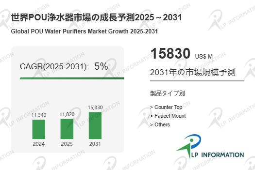 LP Informationの「世界POU浄水器市場の成長予測2025~2031」(https://www.lpinformation.jp/reports/86161/pou-water-purifiers)によると、2025年から2031年の予測期間中、グローバルPOU浄水器市場は年平均成長率(CAGR)5.0%で拡大する見込みである。特に家庭用と小規模事業所向けの需要が市場を牽引し、2031年には158.3億米ドル規模に達すると予測されている。地域別では、北米・欧州が高い普及率を示す一方で、アジア太平洋地域では都市化の進展と飲料水安全意識の向上により、急速な市場拡大が見込まれる。製品タイプ別では、逆浸透型やフィルター交換型の浄水器が高い成長を示す。市場規模データからも、POU浄水器は今後の水処理市場における戦略的製品であることが明確である。