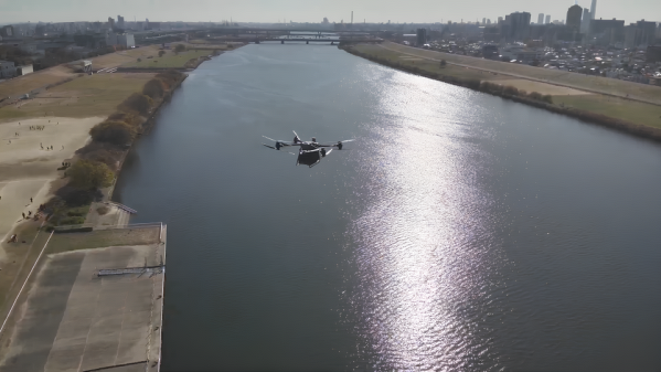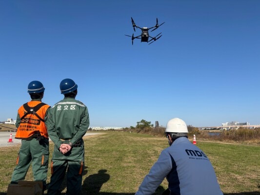 実際に、震災を想定し荒川河川の右岸から左岸を大型ドローンを用いて物資輸送の訓練・検証を行いました。