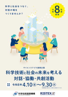2026年度は、さらに多様なステークホルダーが対話・協働し、シンポジウム、フォーラム、サイエンスカフェ、ワークショップ等の双方向コミュニケーションを通じて社会実装につなげる企画を広く募集します。応募可能な機関・応募者は、日本国内の大学・研究機関およびその機関に所属する研究者やURA等です。初めての方の積極的なご応募もお待ちしております。