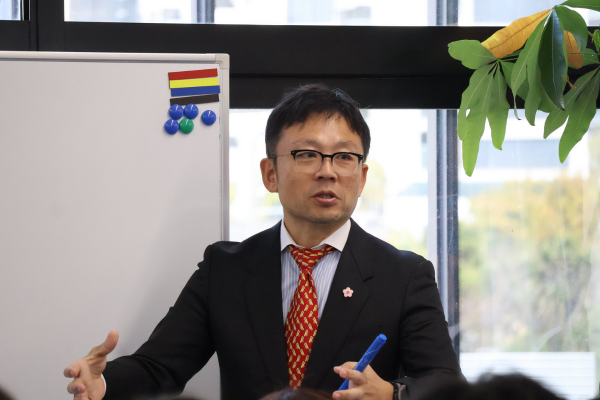 交流会には新入社員のほか、明日香野社長・此下竜矢、取締役鈴木敬太、他グループ各社の経営陣、実業団チーム「ルーセント」の選手たち、グループがサポートする硬式テニスの福田勝志プロが参加。これから共に働いていく仲間たちを歓迎しました。