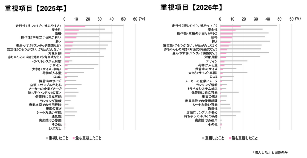 また、購入時に重視する項目として「走行性」「安全性」に加えて「操作性」の割合が大幅に増加し、「価格」を超えた。特に、アップリカやサイベックスは2025年・2026年にかけて操作性を重視した新モデルを発売開始したことから、機能性を強化した製品がシェア拡大の一因となっている可能性がある。