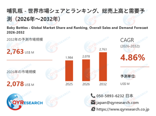 QYResearch調査チームの最新レポート「哺乳瓶―グローバル市場シェアとランキング、全体の売上と需要予測、2026~2032」によると、哺乳瓶の世界市場は、2025年に1984百万米ドルと推定され、2026年には2078百万米ドルに達すると予測されています。その後、2026年から2032年にかけて年平均成長率(CAGR)4.86%で推移し、2032年には2763百万米ドルに拡大すると見込まれています。