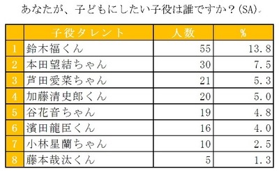 芦田愛菜ちゃんを筆頭にめざましい活躍の子役タレントですが、同じ年代の子どもをもつお母さんたちに聞いてみたところ、子どもにしたい子役1位は「鈴木福くん」という結果になりました。ドラマはもちろんのこと、バラエティ、声優と幅広い活躍を見せる福くんが2位を大きく引き離す票差で1位になりました。また、2位には、芦田愛菜ちゃんをおさえ、ドラマ「家政婦のミタ」の阿須田希衣役で人気を博した「本田望結ちゃん」がランクインしています。3位には、バラエティでもレギュラーを持つ「芦田愛菜ちゃん」、4位に子ども店長で有名な「加藤清史郎くん」、5位に「谷花音ちゃん」が続いています。