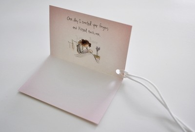 カード中面には「One day I counted your fingers and kissed each one.」(あのひ、わたしは あなたの ちいさな ゆびを かぞえ、その いっぽん いっぽんに キスをした。)の一節と、絵本のイラスト入り。