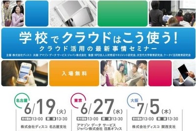 就職・進学情報会社の株式会社ディスコ(本社:東京都文京区 代表取締役社長:夏井丈俊)は、教職員をはじめとした「教育」に関わる方々を対象に、「学校でクラウドはこう使う!クラウド活用の最新事情セミナー」を無料で開催します。6月19日(火)名古屋、27日(水)東京、7月5日(木)大阪の3都市で、教育機関におけるクラウドコンピューティングの活用方法とICT利活用教育の最新事例をご案内します。