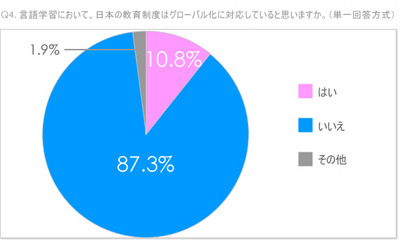 日本の言語教育のグローバル化に関しては、87.3%の保護者が「対応していない」と回答。「実際使える言語能力が身につくかと言えば・・・疑問。」という声もあがっており、学校教育では、昨年度より小学校外国語活動の必修化、続いて今年度、中学校の指導要領の改定と順次教育改革は行っているものの、現時点では、保護者の多くが日本の言語教育がグローバル化社会に対応していないと認識しているようだ。