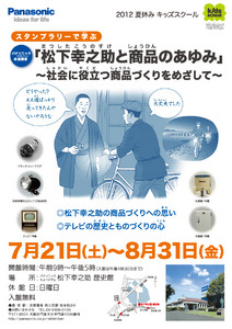 パナソニック株式会社(本社:大阪府門真市、http://panasonic.co.jp)は、大阪府門真市の松下幸之助歴史館にて、2012夏休みキッズスクール特別展示「スタンプラリーで学ぶ 松下幸之助と商品のあゆみ~社会に役立つ商品づくりをめざして~」を7月21日~8月31日の36日間、開催いたします。また、期間中にご来館いただいた小学生・中学生の方で、クイズ付きスタンプラリーに参加いただき、全問出来た方には、歴史家電のペーパークラフトをプレゼントいたします!