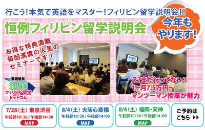 フィリピン英語留学を専門的に取り扱う株式会社ジージー(ブランド名:フィリピン留学ドットコム│大阪府大阪市中央区│代表:平田 利行)は、8月度の説明会として8月4日(土)に大阪は心斎橋のオフィスラウンジ、福岡ではアクロス福岡にて、フィリピンでの英語語学留学を希望する方を対象にした留学セミナーを開催致します。