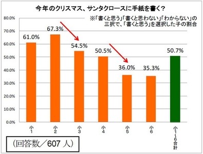 小学生の50.7%がサンタクロースに手紙を書く。 最も多い小2では67.3%