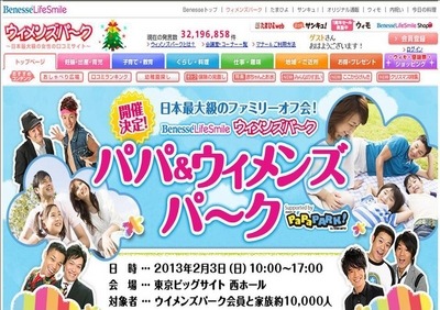 このたび株式会社ベネッセコーポレーションが運営する日本最大級の女性口コミサイト『ウィメンズパーク』は、株式会社よしもとクリエイティブ・エージェンシーが運営する子育て応援プロジェクト『パパパーク』の協力のもと2013年2月3日(日)に家族向けのイベント『パパ&ウィメンズパーク』を開催することを決定し、本日より告知のためのスペシャルサイトをオープンいたします。このイベントは、主に妊婦・子育て中の女性へ向けたものとなり、スペシャルサイトより参加のお申し込みをいただけます。
