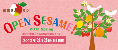 プロ翻訳家の育成を目的とする翻訳の専門校フェロー・アカデミー(運営会社:株式会社アメリア・ネットワーク、本社/本校:東京都港区、代表取締役社長:室田陽子)は、翻訳イベント「オープンセサミ2 0 1 3春」を3月3日(日)に開催、2月1日(金)よりWe bサイト( h t t p : / / w ww . f e l l o w - a c a d em y . c o m)で申込受付を開始しました。
