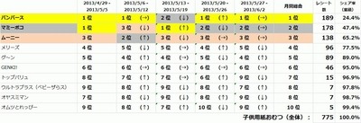 対象期間内の子供用紙おむつの購入は全体で775レシートでした。その内上位5ブランドで690レシートとなり、全体の89.0%を占めました。ブランド別にみると、1位パンパース(P&G)が189レシート、2位マミーポコ(ユニ・チャーム)が178レシート、3位ムーニー(ユニ・チャーム)が138レシート、4位メリーズ(花王)が96レシート、5位グ~ン(大王製紙)が89レシートとなりました。子供用紙おむつの購入が売れ筋ブランドに集中していることがわかります。