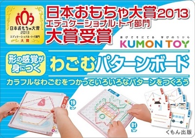 株式会社くもん出版(代表取締役社長 志村直人/以下くもん出版)の「わごむパターンボード」が、2013年6月11日、一般社団法人日本玩具協会が主催する「日本おもちゃ大賞2013」において、エデュケーショナル・トイ部門 大賞を受賞しました。また、同商品は、認定NPO法人日本グッド・トイ委員会による「グッド・トイ2013」にも選定されました。