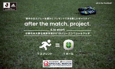 Jリーグのオフィシャルエキップメントパートナーであるアディダス ジャパン株式会社(本社:東京都港区六本木、代表取締役:ポール・ハーディスティ)は、6月16日(日)に国立競技場で開催する『東日本大震災復興支援 2013Jリーグスペシャルマッチ』にて、”試合終了後に始まるチャリティプロジェクト”をコンセプトにした、選手の全力プレーをプレゼントに変える新しいチャリティ活動『after the match, project』を東日本大震災被災地復興支援の一環として実施いたします