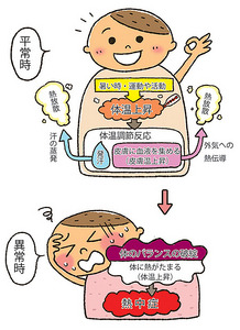 私たちの体は、血管を広げて外気に体内の熱を放射したり、汗をかいて蒸発させたりして体温の急激な上昇を防いでいます。しかし、気温が高いと体内の熱は放散されず、湿度が高いと汗は蒸発しません。